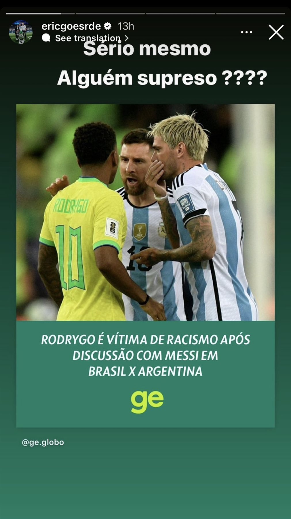 ودخل رودريجو في مشادة مع ميسي خلال مباراة البرازيل والأرجنتين الأخيرة، في تصفيات أمريكا الجنوبية المؤهلة لكأس العالم، تسببت في تعرضه لإساءات عنصرية، من محبي نجم التانجو.