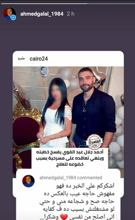 وأعاد أحمد جلال عبد القوي نشر خبر دخوله مركز إعادة تأهيل وفسخ خطبته وإنهاء عقده على إحدى المسرحيات، عبر حسابه بموقع انستجرام مع تعليق: أشكركم على الخبر ده فهو مفهوش حاجة عيب بالعكس ده حاجة صح وشجاعة مني وحتى لو مشتغلتش بسبب ده ف كفاية إني أصلح من نفسي وشكرا.