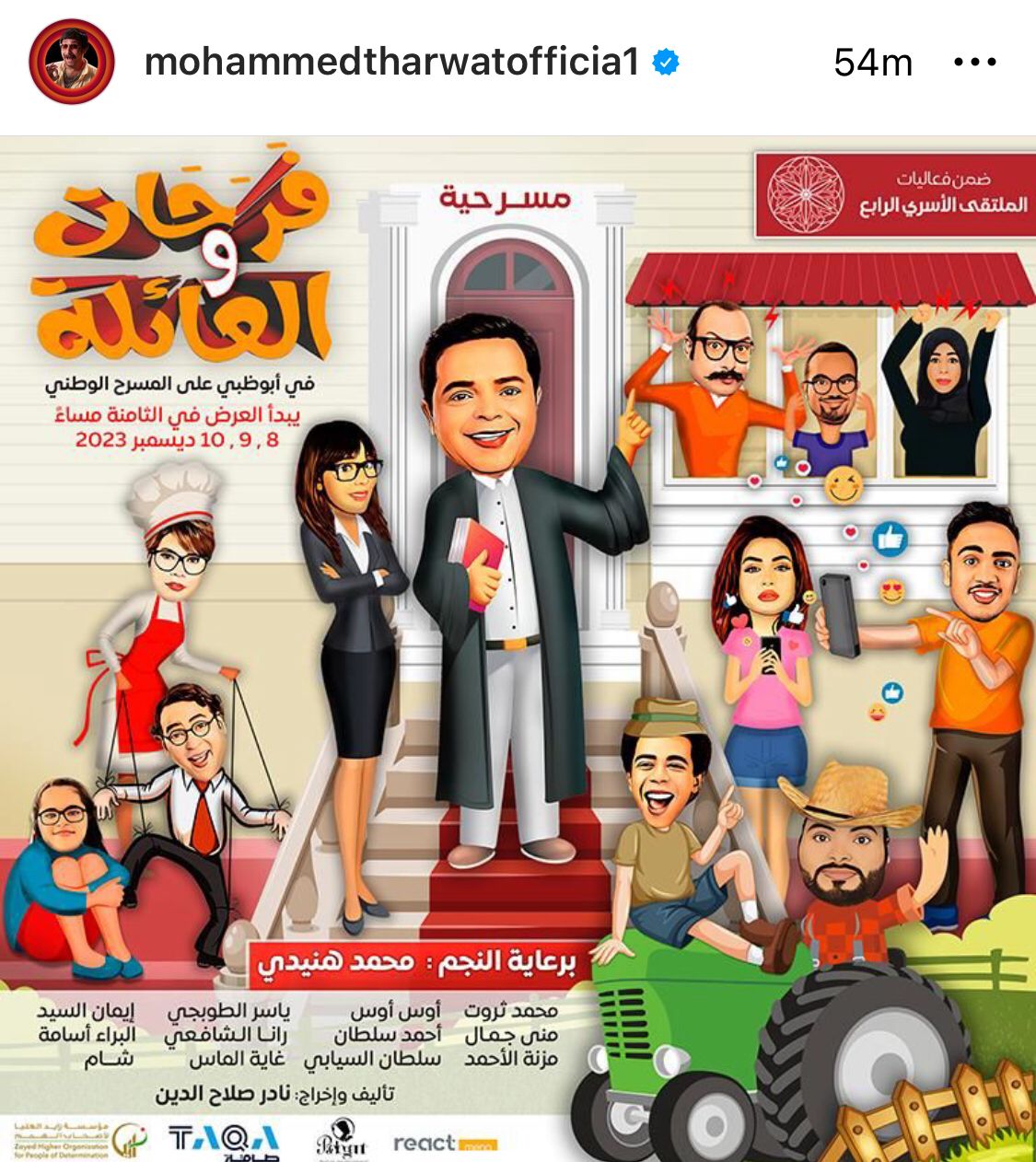 روج الفنان محمد ثروت، لمسرحية فرحات والعائلة بطولة الفنان محمد هنيدي، والمقرر عرضها في دولة الإمارات العربية المتحدة على خشبة المسرح الوطني بـ أبوظبي.