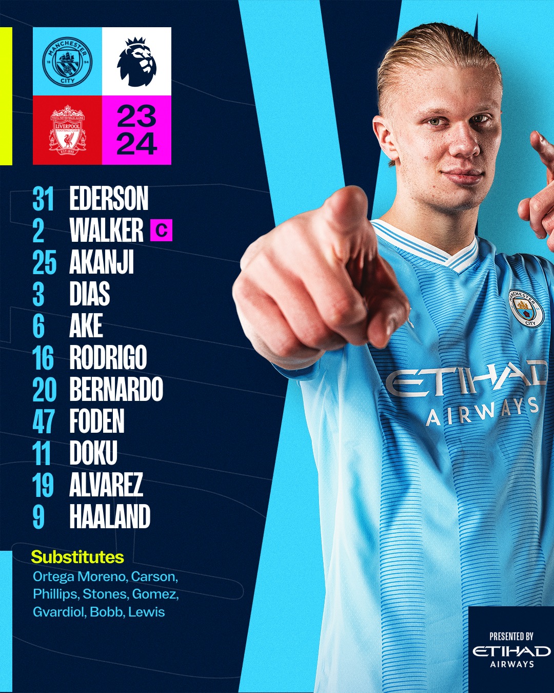 - خط الهجوم: إيرلينج هالاند- جوليان ألفاريز- جيريمي دوكو.