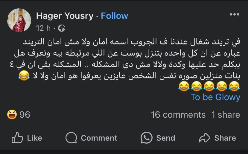 وعلقت أخرى، على هذا التريند، قائلة في منشور لها عبر فيسبوك: فيه تريند شغال عندنا في الجروب اسمه أمان ولا مش أمان، التريند عبارة عن إن كل واحدة بتنزل بوست عن اللي مرتبطه بيه وتعرف هل بيكلم حد عليها وكدة ولا لا، مش دي المشكلة.. المشكله بقى إن في ٤ بنات منزلين صوره نفس الشخص، وعايزين يعرفوا هو أمان ولا لا.