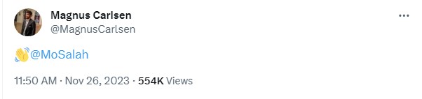 نشر ماجنوس كارلسن تغريدة عبر حسابه الرسمي على موقع X، تضمت رمز تعبيري عن التحية، وإشارة إلى حساب محمد صلاح لتحديه في مباراة.