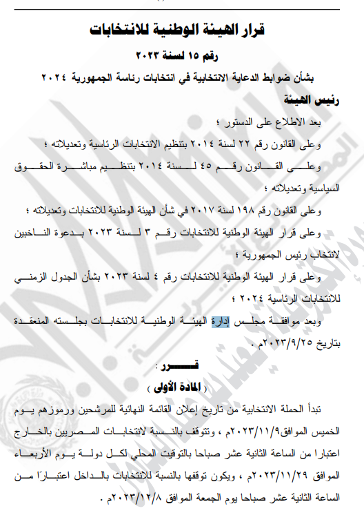 ونص قرار الوطنية للانتخابات في هذا الصدد، على أن تبدأ الحملة الانتخابية من تاريخ إعلان القائمة النهائية للمرشحين ورموزهم يوم الخميس الموافق 2023/11/9م، وتتوقف بالنسبة لانتخابات المصريين بالخارج اعتبارا من الساعة الثانية عشر صباحا بالتوقيت المحلي لكل دولة يوم الأربعاء الموافق 2023/11/29م، ويكون توقفها بالنسبة للانتخابات بالداخل اعتبارا من الساعة الثانية عشر صباحا يوم الجمعة الموافق 2023/12/8م.