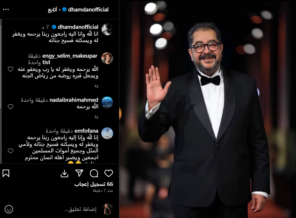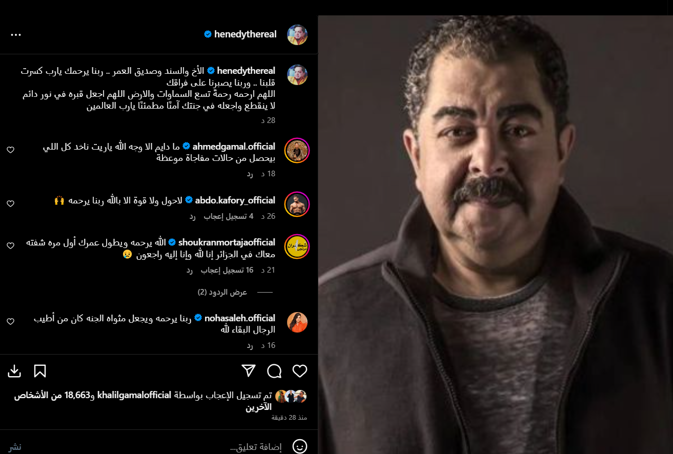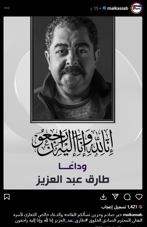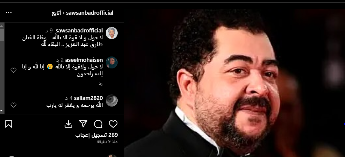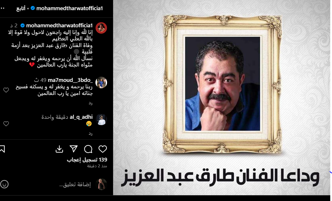 وكتب الفنان محمد ثروت عبر حسابه على انستجرام، الآتي: إنا لله وإنا إليه راجعون لا حول ولا قوة إلا بالله العلي العظيم.. وفاة الفنان طارق عبد العزيز بعد أزمة قلبية، نسأل الله أن يرحمه ويغفرله ويجعل مثواه الجنة يارب العالمين.