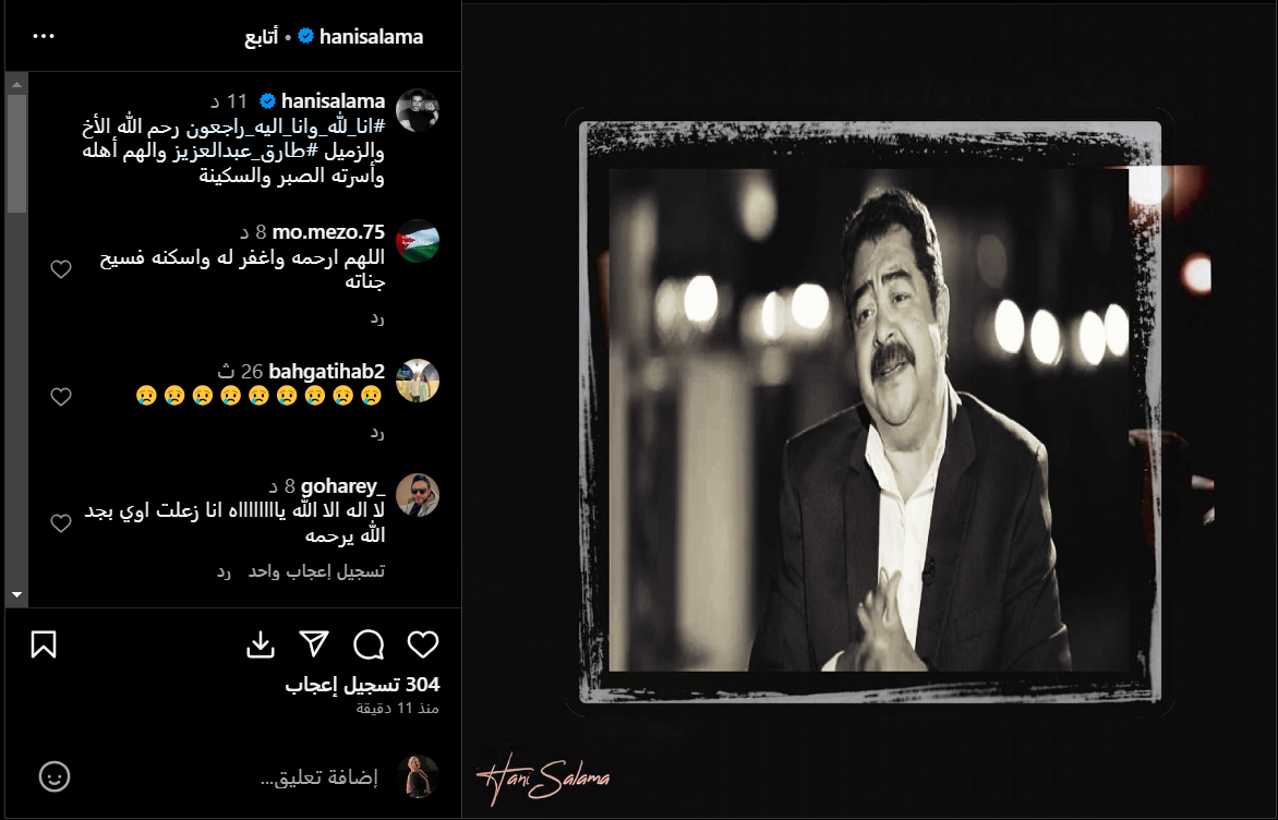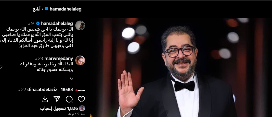 ودعا الفنان هاني سلامة للفنان طارق عبد العزيز، وكتب على انستجرام: إنا لله وإنا إليه راجعون رحم الله الأخ والزميل طارق عبد العزيز والهم أهله وأسرته الصبر والسكينة.