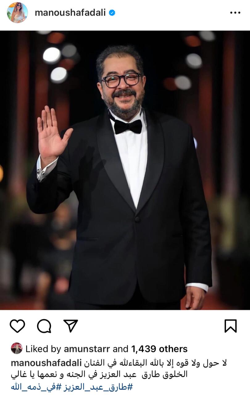 كما نشرت الفنانة دانا حمدان صورة طارق عبد العزيز على انستجرام، وكتبت: إنا لله وإنا إليه راجعون ربنا يرحمه ويغفرله ويسكنه فسيح جناته.
