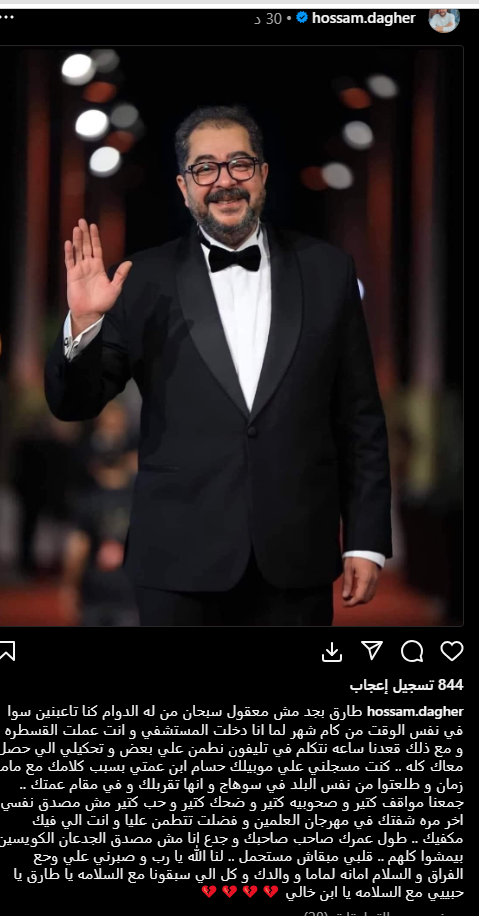 وأضاف: جمعنا مواقف كتير وصحوبية كتير وضحك كتير وحب كتير مش مصدق نفس آخر مرة شفتك في مهرجان العلمين وفضلت تتطمن عليا وأنت اللي فيك مكفيك، طول عمرك صاحب صاحبك وجدع أنا مش مصدق الجدعان الكويسين بيمشوا كلهم، قلبي مبقاش مستحمل، لنا الله يارب وصبرني على وجع الفراق والسلام أمانة لماما ووالدك وكل اللي سبقونا مع السلامة يا طارق يا حبيبي مع السلامة يا ابن خالي.