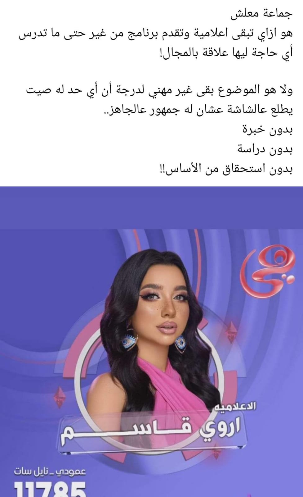 فيما كتب آخر: يعني اربع سنين تعب ومذاكرة ومصاريف ومشاوير رايح جاي للكلية من اخر الدنيا ومواصفات مذيع وحاجات كتير اوي بتقول مش اي حد يبقى مذيع بس فجأة بتلاقي ان اي حد يبقى مذيع عادي..الفكرة ان خريجين اعلام مش لاقيين حتى مكان للتدريب بس هنشوف أروى قاسم مذيعة..فين نقابة الإعلاميين بقى..فين نظرية الحارس اللي لسه ممتحنة فيها؟