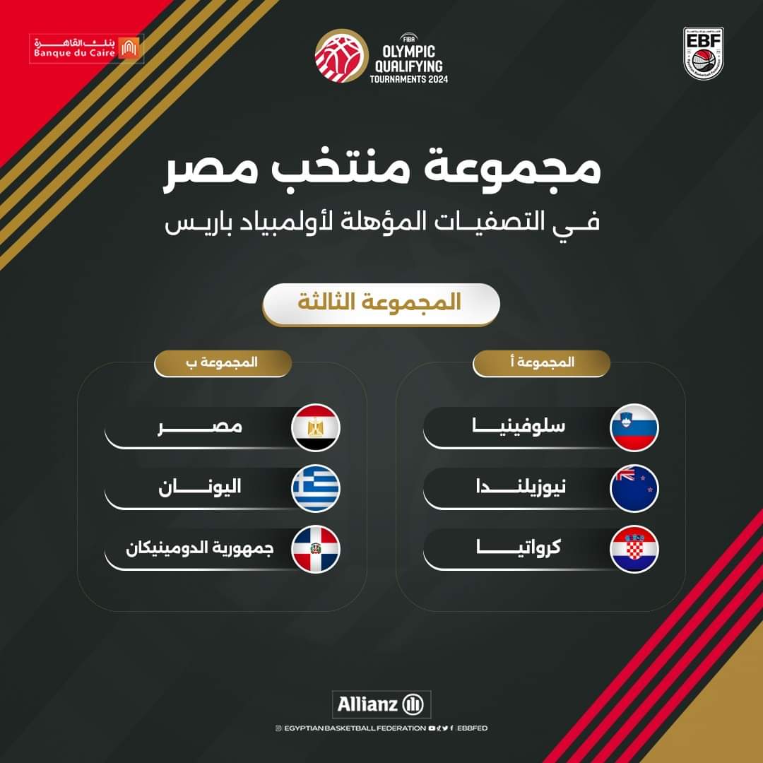وضعت قرعة تصفيات كرة السلة المؤهلة لأولمبياد باريس 2024، والتي أقيمت في سويسرا في مدينة ميس، منتخب مصر في مجموعة قوية تضم كل من منتخبات اليونان والدومينيكان وسلوفينيا - نيوزيلندا - كرواتيا.