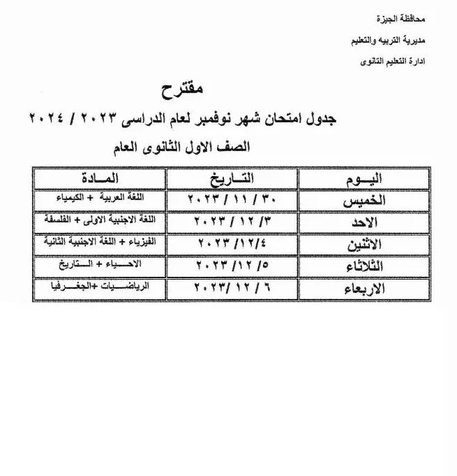 تبدأ الخميس.. جدول امتحانات شهر نوفمبر 2023 لـ طلاب الصف الأول الثانوي بالجيزة