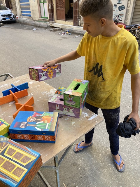 وأشار بغدادي إلى أنه استطاع من خلال هؤلاء الشباب إنتاج تحف فنية مثل علب مناديل خشبية برسومات شعبية من التراث والفلكلور الشعبي الصعيدي.