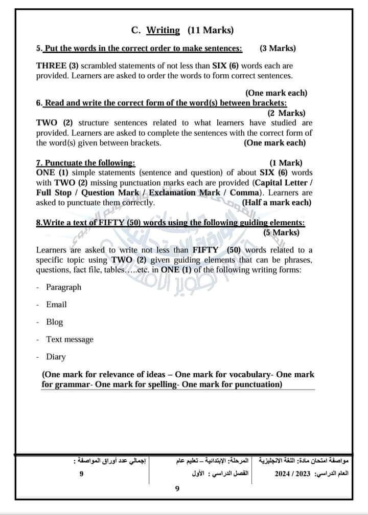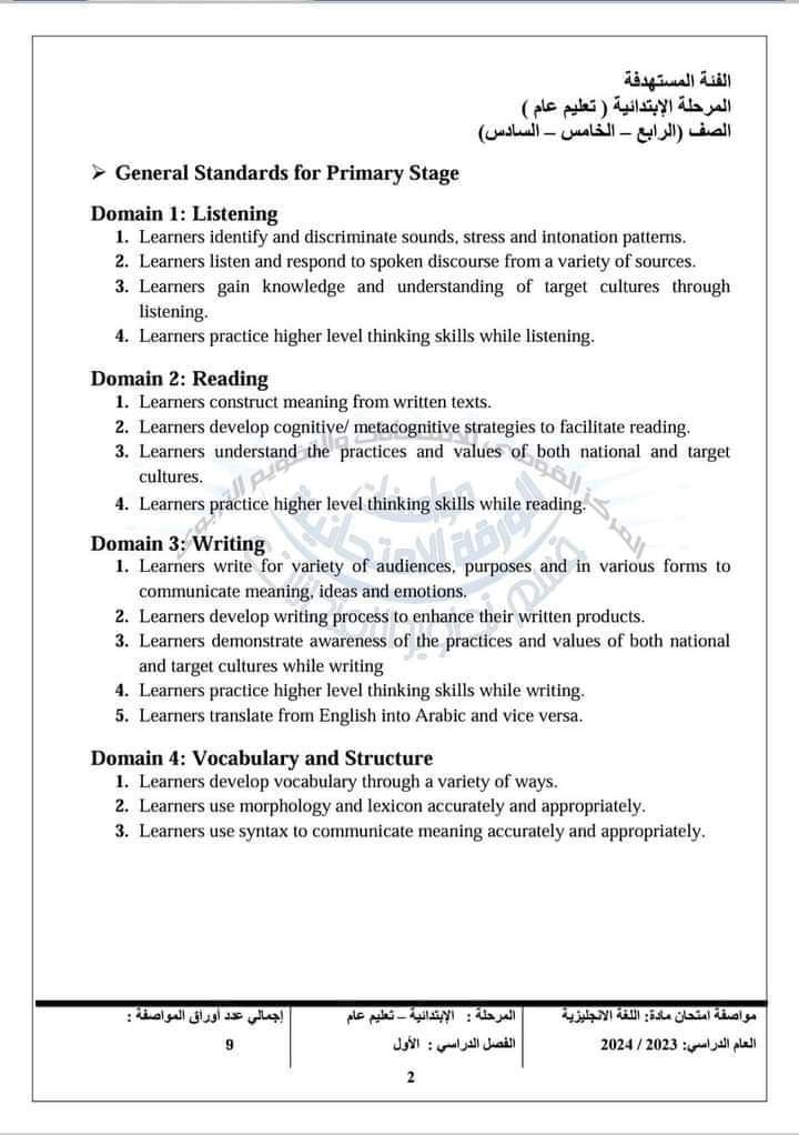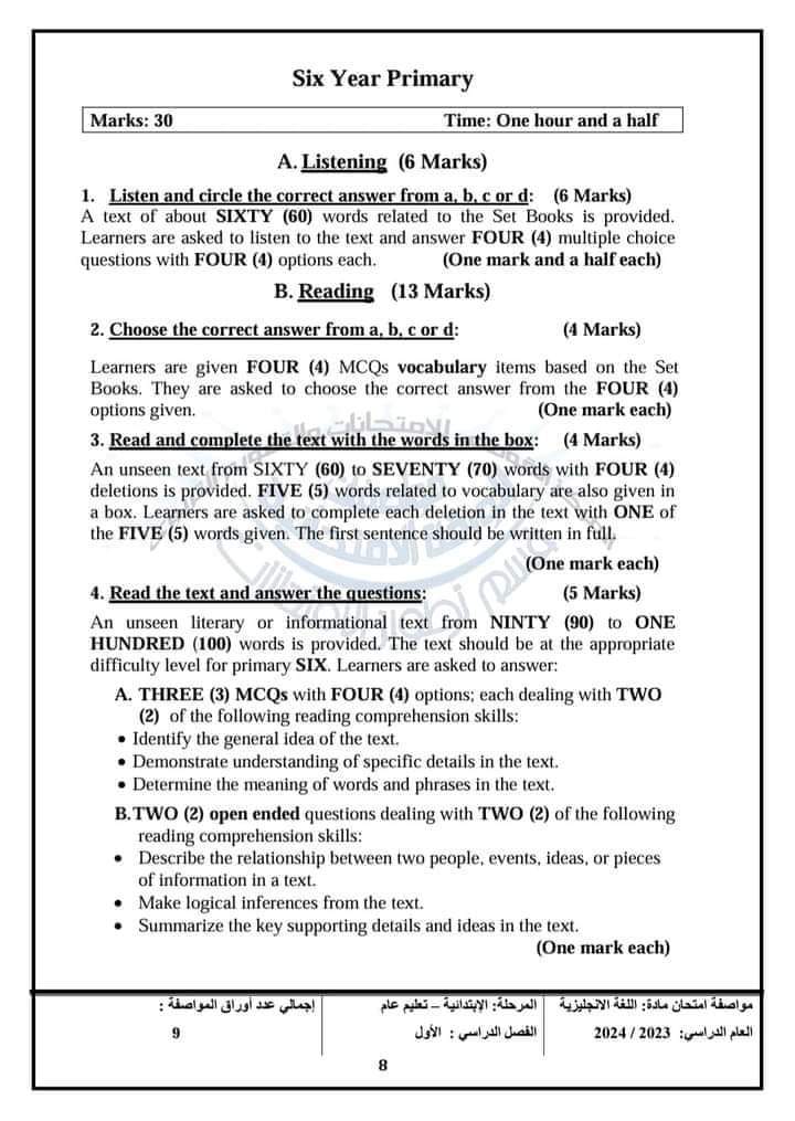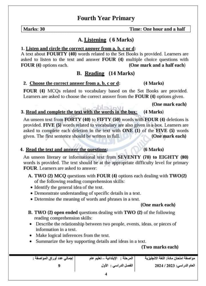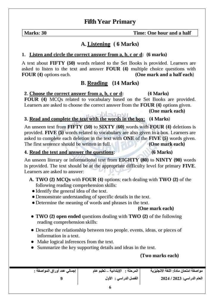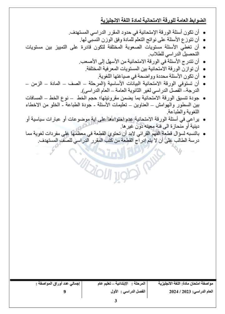 أعلن المركز القومي للامتحانات والتقويم التربوي، في خطاب لها الضوابط العامة للورقة الامتحانية لمادة اللغة الانجليزية الفصل الدراسي الأول، لـ طلاب الرابع والخامس والسادس الابتدائي كالاتي: