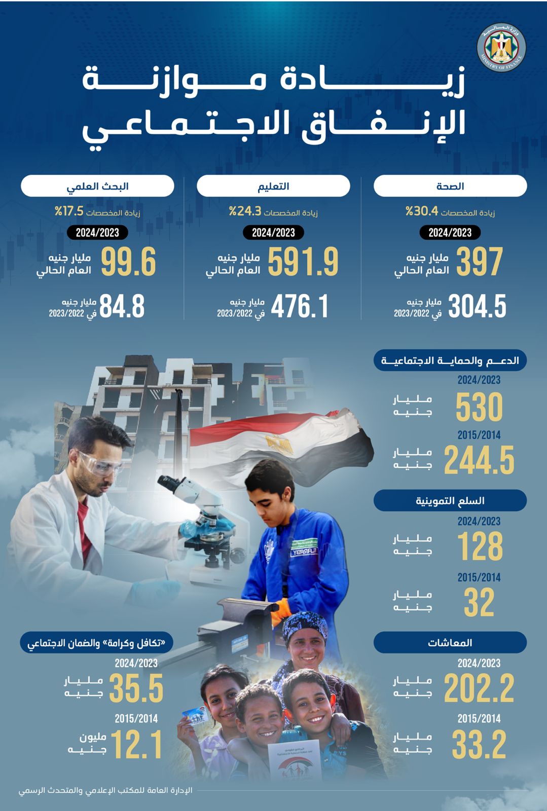 قال الوزير، إننا مستمرون بالتوسع في الحماية الاجتماعية ببرامج ومبادرات أكثر فعَّالية وتأثيرًا في حياة الناس لتخفيف الأعباء الاقتصادية عن كاهلهم في ظل الأزمات العالمية المتعاقبة، لافتًا إلى أنه تم تخصيص 530 مليار جنيه في العام المالي الحالي 2023/ 2024 لبرامج الدعم والحماية الاجتماعية، مقارنة بنحو 244.5 مليار جنيه في العام المالي 2014/ 2015 بزيادة 285.5 مليار جنيه، وسداد 202.2 مليار جنيه لصالح المعاشات مقارنة بـ 33.2 مليار جنيه عام 2014/ 2015، وزيادة مخصصات معاش الضمان الاجتماعي وبرنامج تكافل وكرامة من 12.1 مليارات جنيه في 2014/ 2015 إلى 35.5 مليار جنيه، وارتفاع مخصصات تمويل الإسكان الاجتماعي من 150 مليون جنيه في العام المالي 2014/ 2015 إلى 12.1 مليار جنيه في موازنة العام المالي الحالي، وارتفع دعم السلع التموينية إلى 128 مليار جنيه مقارنة بـ 32 مليار جنيه في 2014/ 2015.