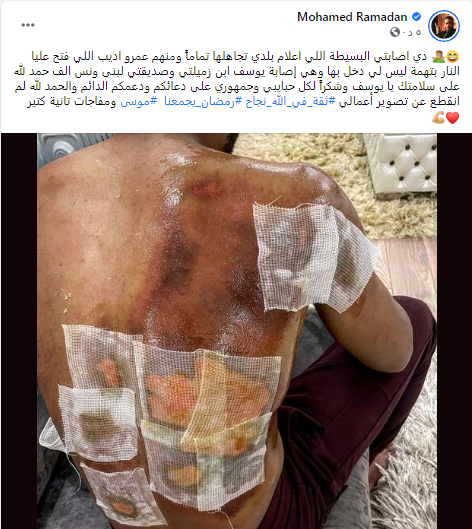 من ناحيته، وجه محمد رمضان رسالة عتاب لـ عمرو أديب بسبب تجاهله الحديث عن إصابته، إذ نشر صورة عبر صفحته بموقع فيس بوك تظهر إصابته وقال: دي إصابتي البسيطة اللي إعلام بلدي تجاهلها تمامًا ومنهم عمرو أديب اللي فتح عليا النار بتهمة ليس لي دخل بها وهي إصابة يوسف ابن زميلتي وصديقتي لبنى ونس.