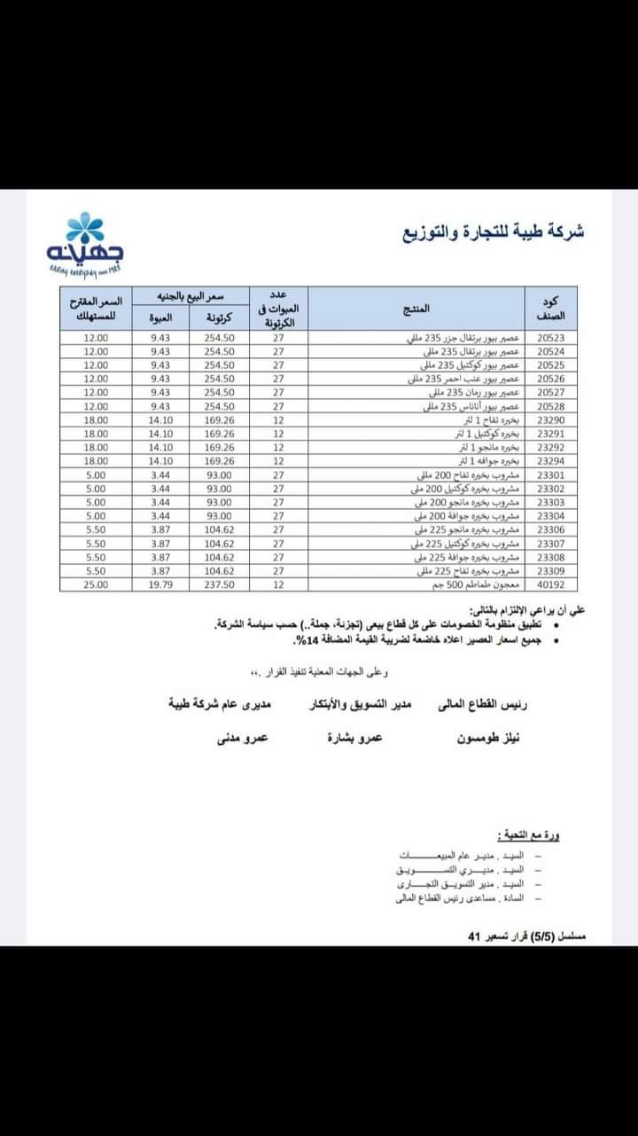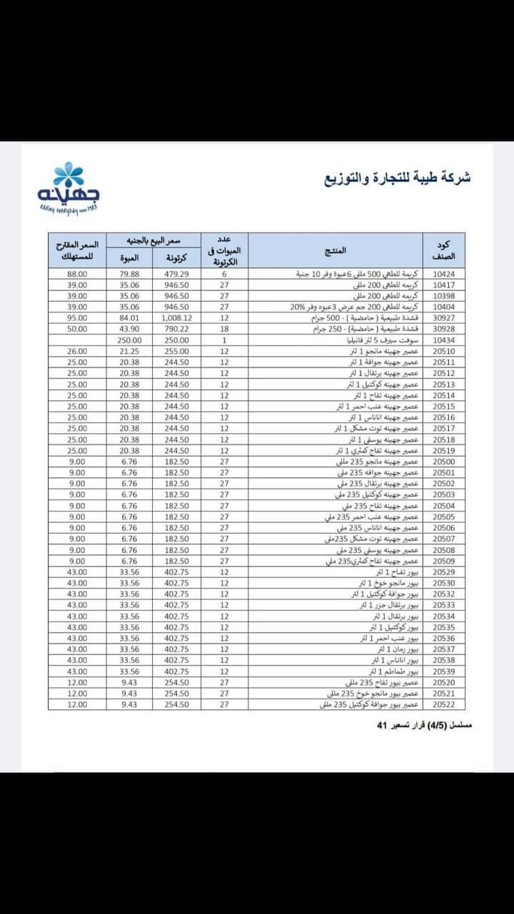 ورفعت جهينة سعر لتر عصير بيور تفاح وبرتقال وكوكتيل وعنب أحمر وأناناس وطماطم إلى 43 جنيها للتر.