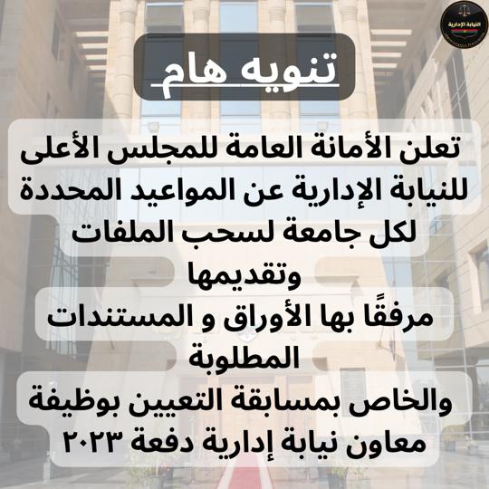 وقالت النيابة الإدارية في بيان لها، اعلان الأمانة العامة للمجلس الأعلى للنيابة الإدارية عن المواعيد المحددة لكل جامعة لسحب الملفات وتقديمها مرفقًا بها الأوراق والمستندات المطلوبة والخاص بمسابقة التعيين بوظيفة معاون نيابة إدارية دفعة ۲۰۲۳
