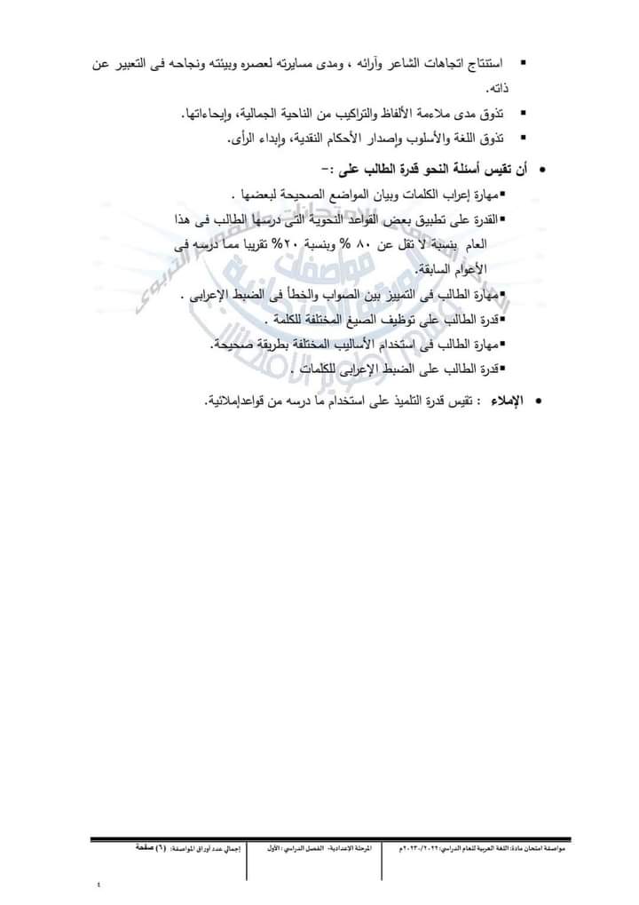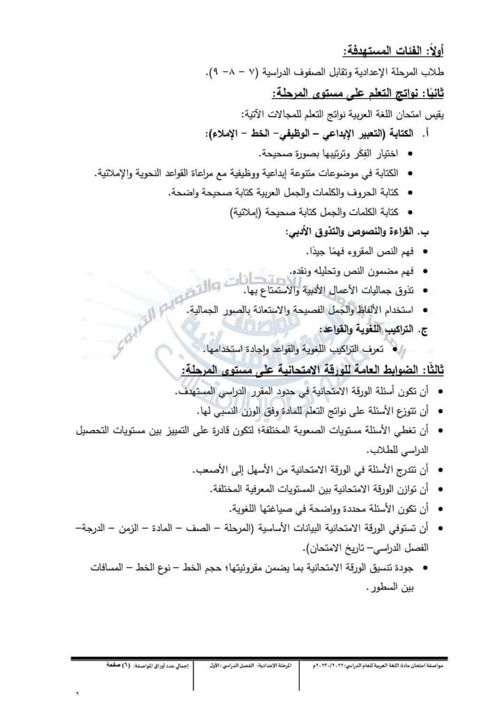 مواصفات امتحانات اللغة العربية للمرحلة الإعدادية