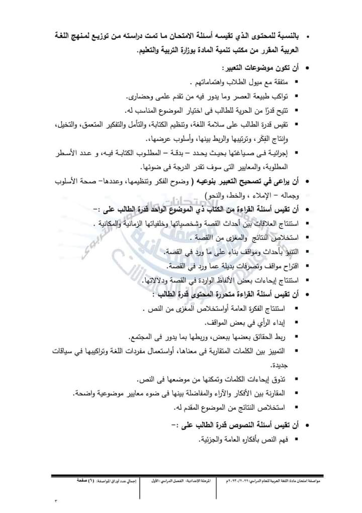 وجاءت مواصفات امتحانات مادة اللغة العربية للمرحلة الإعدادية 2024 كالآتي: