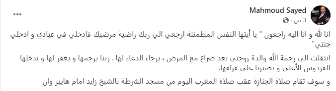 وكتب محمود سيد زوج عليا صبحي، عبر صفحته بموقع فيسبوك: إنا لله وإنا إليه راجعون، يا أيتها النفس المطمئنة ارجعي إلى ربك راضية مرضية فادخلي في عبادي وادخلي جنتي.. انتقلت إلى رحمة الله والدة زوجتي بعد صراع مع المرض.
