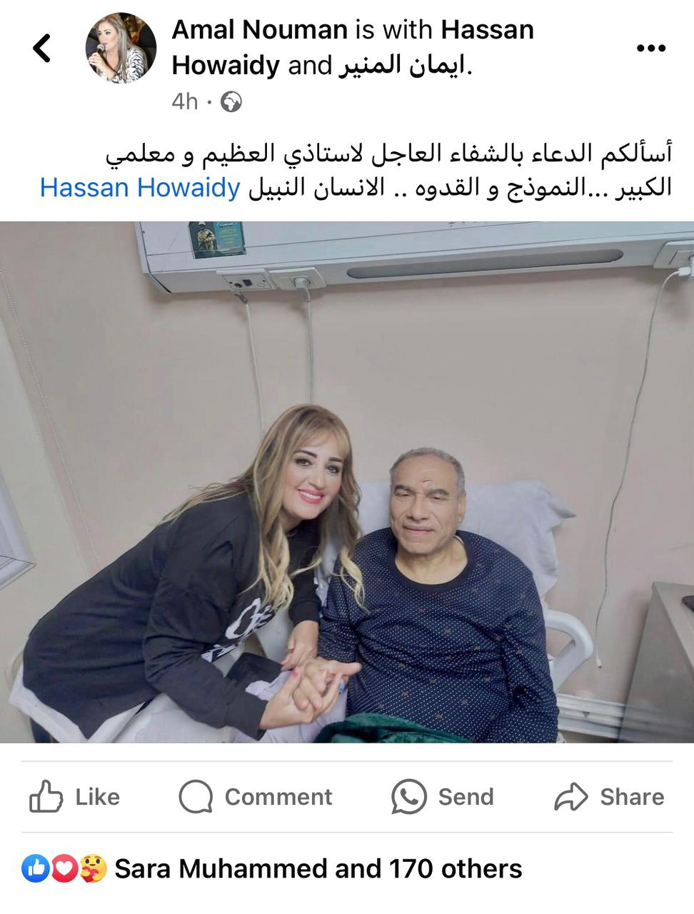 ونشرت أمل نعمان، مذيعة نشرة بالتلفزيون المصري، صورة جمعتها بالإعلامي حسن هويدي من داخل المستشفى، عبر حسابها الشخصي بموقع التواصل الاجتماعي فيسبوك، وعلقت قائلة: أسألكم الدعاء بالشفاء العاجل لأستاذي العظيم ومعلمي الكبير، النموذج والقدوة، الإنسان النبيل حسن هويدي.