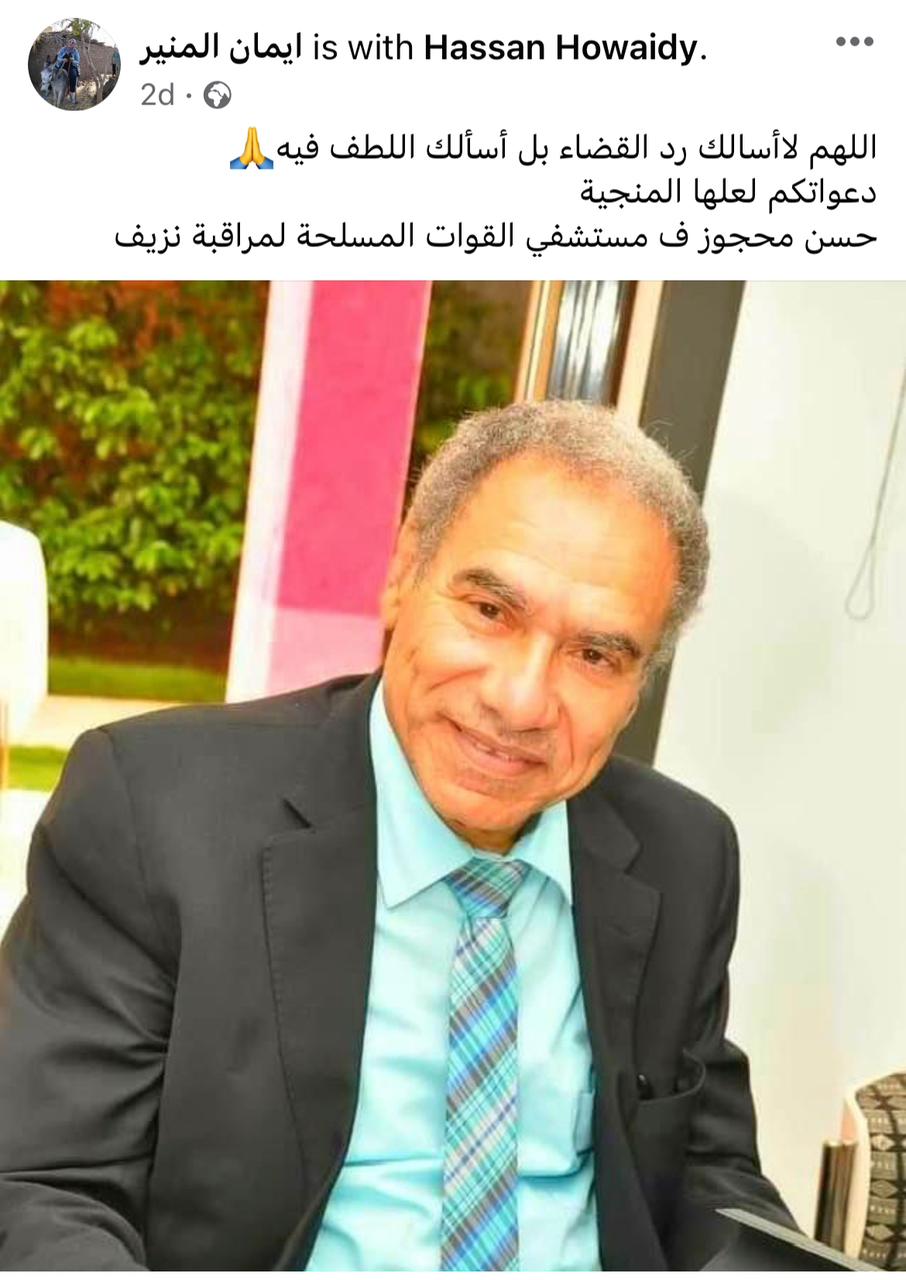 وسبق وأن طالبت زوجة الإعلامي حسن هويدي، الدعاء له، حيث كتبت عبر حسابها بموقع فيسبوك: اللهم لا أسألك رد القضاء بل أسألك اللطف فيه.. دعواتكم لعلها المنجية، حسن محجوز في مستشفى القوات المسلحة لمراقبة نزيف.