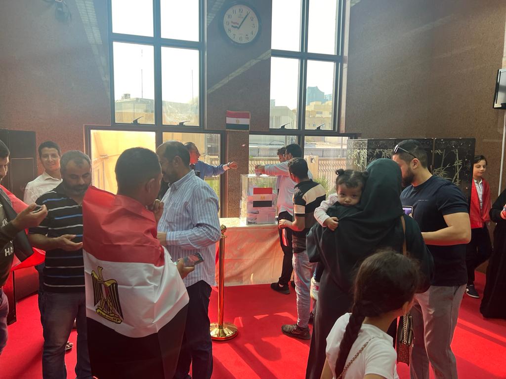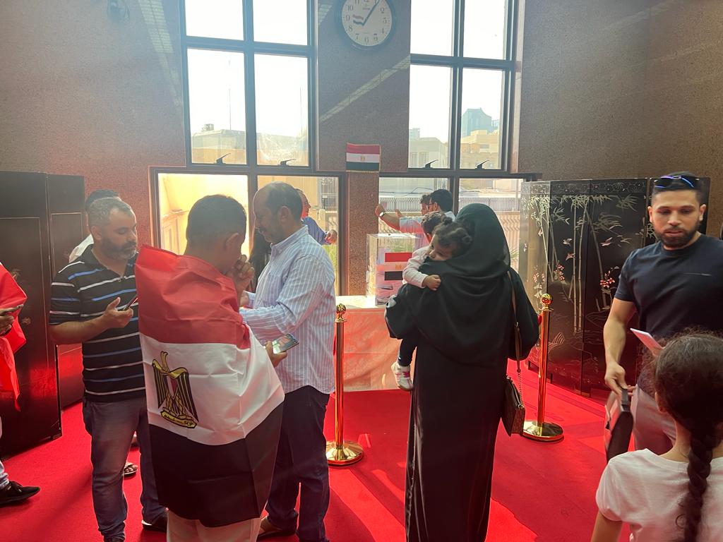 وتهافت المصريين على اللجام الانتخابية حاملين علم جمهورية مصر العربية، ومصطحبين أطفالهم، حيث يتمكن الجيل الجديد من المصريين في الخارج معنى الوطنية.