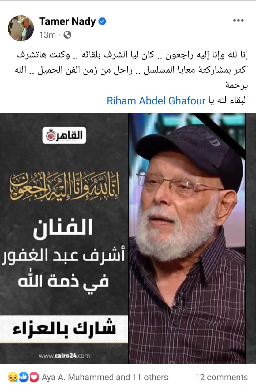 وكتب الفنان يوسف الشريف عبر حسابه على موقع إكس: إنا لله وإنا إليه راجعون.. البقاء والدوام لله الأستاذ أشرف عبد الغفور في ذمة الله ربنا يرحمه ويغفر له ويسكنه فسيح جناته.
