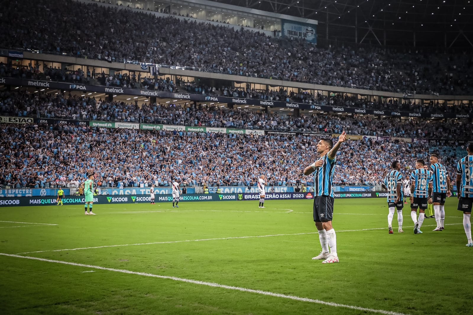 وحرص النجم الأوروجوياني لويس سواريز، على وداع الجماهير في المدرجات وتحيتهم بعد تسجيله هدفا ليقود فريقه جريميو لفوز صعب أمام نظيره فريق فاسكو دا جاما بنتيجة هدف مقابل لاشيء ضمن منافسات مسابقة الدوري البرازيلي الممتاز، في المباراة التي جمعت بين الفريقين على ملعب آرينا جريميو.