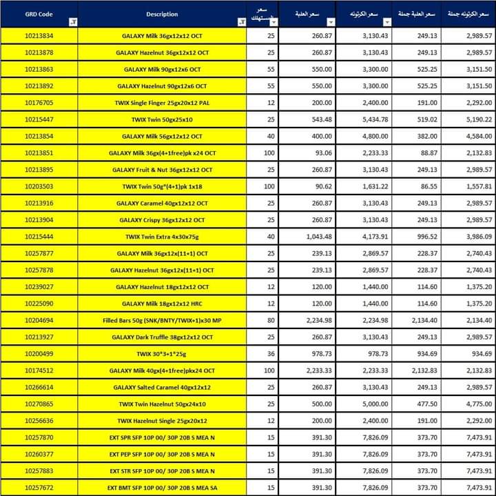 ووفقا لقائمة أسعار الشركة الجديدة التي حصلت القاهرة 24 على نسخة منها، حسب قائمة مرسلة للوكلاء والموزعين، فإن سعر شيكولاتة جلاكسي وزن 30 جرامًا ارتفعت إلى 25 جنيهًا مقابل 17.5 جنيه سعرها السابق، أي بزيادة قدرت بـ 7.5 جنيه.
