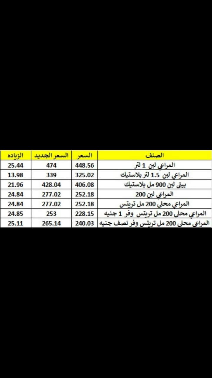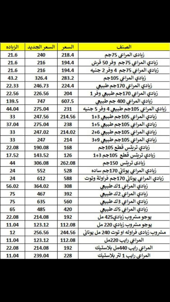 ورفعت شركة المراعي أسعار زبادي المراعي اليوناني 170 جراما إلى إلى 552 جنيها بزيادة 24 جنيها، ورفعت شركة المراعي أسعار زبادي المراعي 1 كيلو طبيعي إلى 364 جنيها للعبوة الواحدة بزيادة 56 جنيها على علبة الزبادي، كما أقرت الشركة زيادة على أسعار زبادي المراعي 2 كيلو طبيعي إلى 467 جنيها بزيادة 75 جنيها للعبوة الواحدة، وأقرت زيادة على عبوة الزبادي ذات الحجم الأكبر المستهلك بكمية أكبر لدى الشركات من وزن 5 كيلو إلى 485 جنيها بزيادة 65 جنيها.
