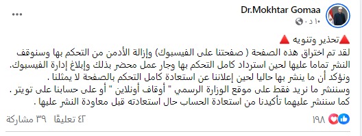 وقال وزير الأوقاف: سنوقف النشر تماما عليها لحين استرداد كامل التحكم بها وجار عمل محضر بذلك وإبلاغ إدارة الفيسبوك، متابعا: ونؤكد أن ما ينشر بها حاليا لحين إعلاننا عن استعادة كامل التحكم بالصفحة لا يمثلنا.