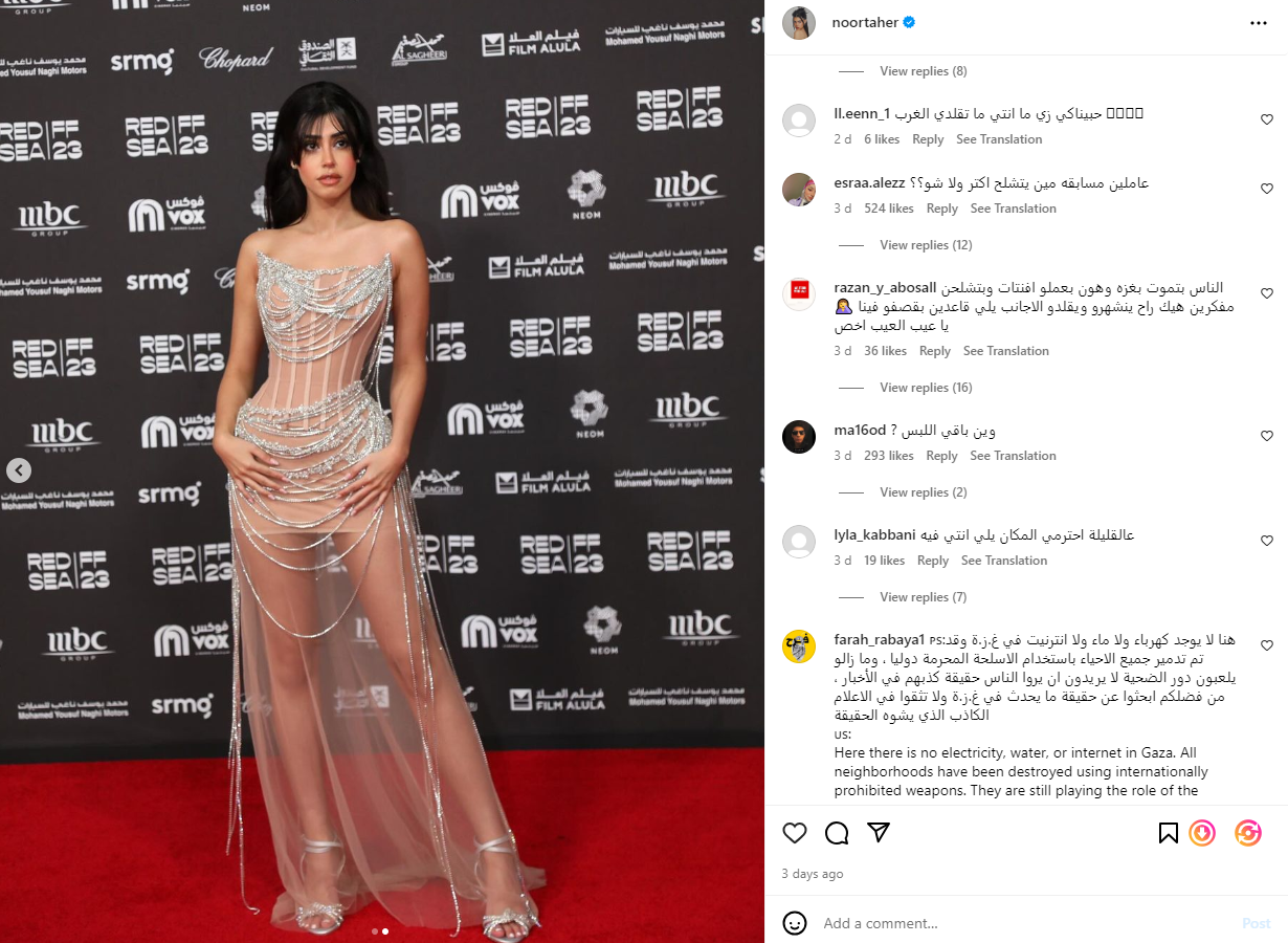 وعلق أحد متابعيها على إطلالتها في مهرجان البحر الأحمر السينمائي: الناس بتموت بغزة وأنتو بتعملوا إفينتات وبتشلحوا ومفكرين أنكم بتقلدوا الأجانب اللي قاعدين يقصفوا فينا.. يا عيب العيب أخص.