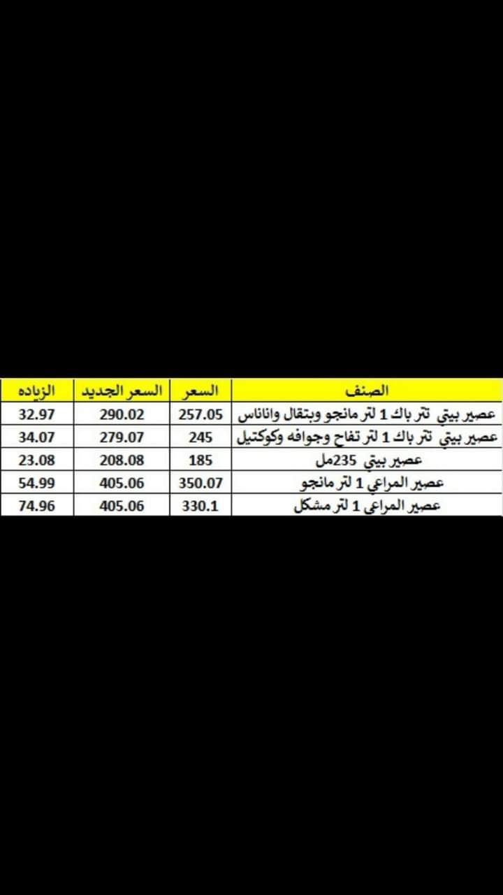 وصعد عصير المراعي 1 لتر مانجو إلى 409 جنيه للكرتونة بزيادة 54 جنيها على الكرتونة. وعصير المراعي 1 لتر ارتفع إلى 405 جنيهات بزيادة 74 جنيها على الكرتونة لشهر ديسمبر.