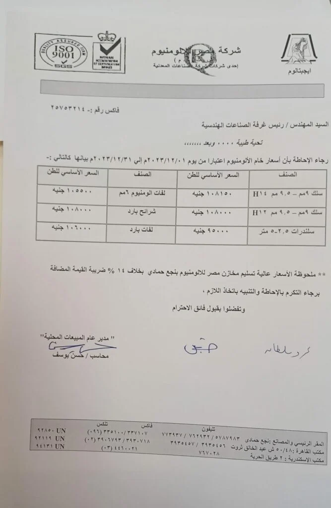 كما صعد سعر طن لفات الألومنيوم إلى نحو 105.5 ألف جنيه بدلا من 100.5 ألف جنيه خلال شهر نوفمبر الماضي، دون إضافة 14% ضريبة القيمة المضافة.