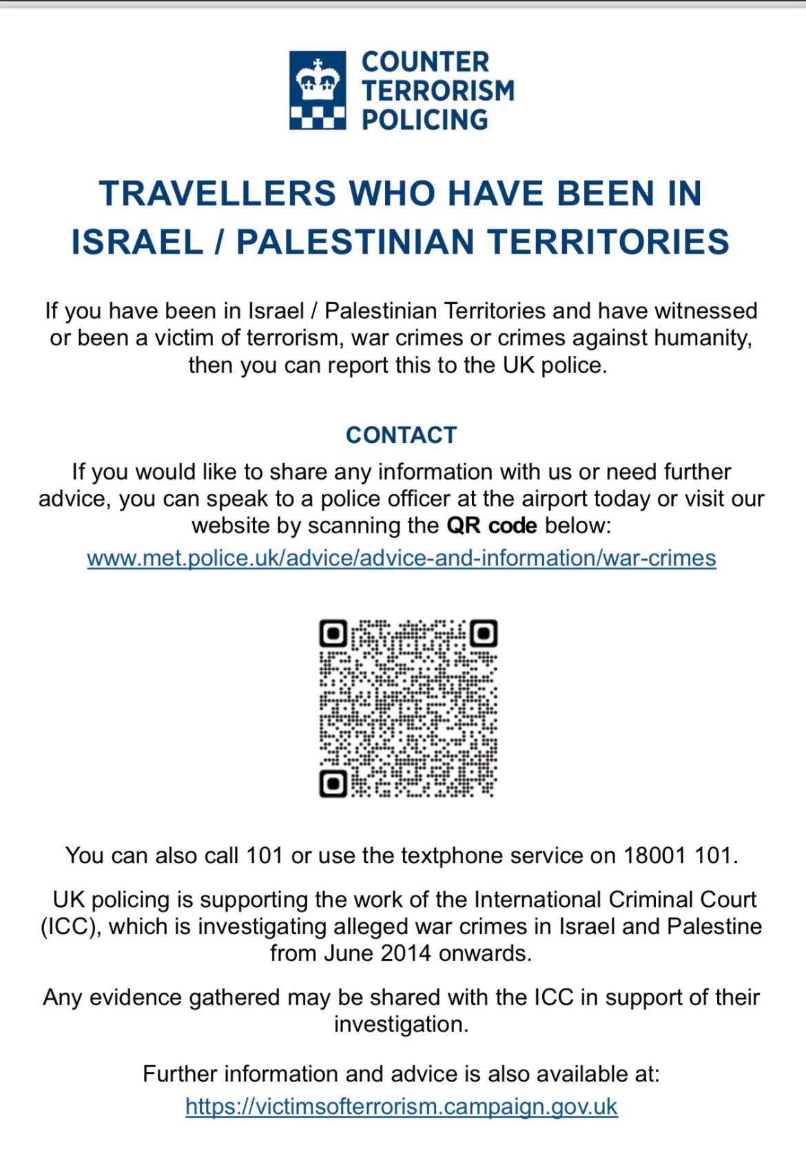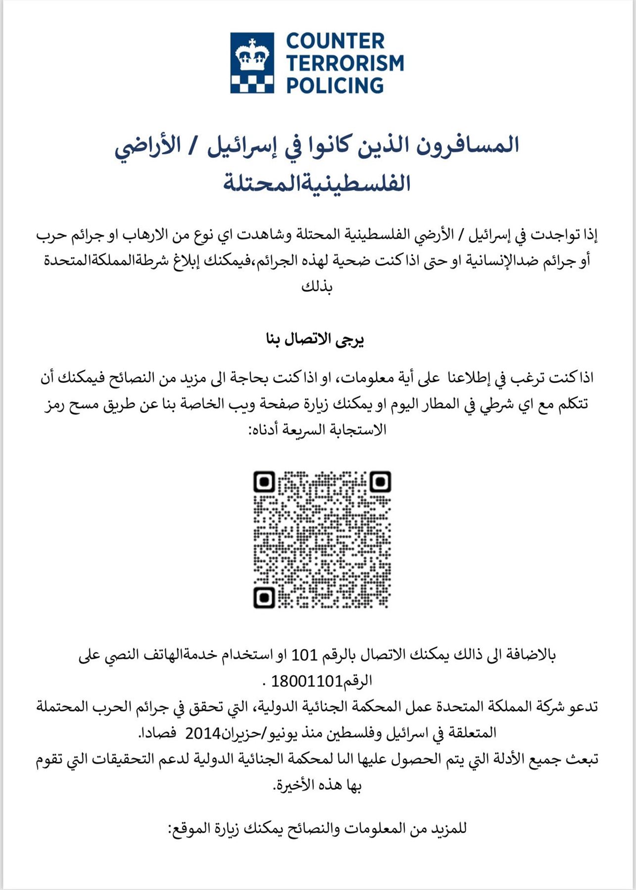 وأعلنت شرطة سكوتلاند يارد البريطانية توسيع تحقيقاتها في جرائم الحرب لتشمل كل الجرائم المرتكبة في جميع المدن الفلسطينية والإسرائيلية عبر فريق جرائم الحرب في قيادة مكافحة الإرهاب بلندن، الشرطة طالبت كل من شهد ارتكاب جريمة حرب في المنطقة منذ عام 2014 بتقديم شهادته إليها عبر موقعها أو الاتصال بالأرقام الموضحة في المنشور المرفق - حيث تستعد لجمع كل الأدلة وتقديمها إلى المحكمة الجنائية الدولية للتحقيق في جرائم الحرب ومحاسبة المجرمين.