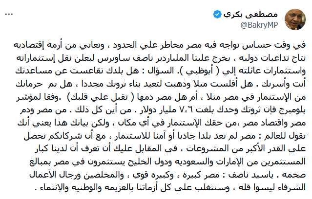 وشهدت تغريدة بكري، عبر منصة إكس - تويتر سابقا - نقدا لاذعا بشأن نقل استثمارات ناصف ساويرس إلى الإمارات، جاء فيها: في وقت حساس تواجه فيه مصر مخاطر علي الحدود، وتعاني من أزمة اقتصادية نتاج تداعيات دولية، يخرج علينا الملياردير ناصف ساويرس ليعلن نقل استثماراته واستثمارات عائلته إلى أبوظبي، السؤال: هل بلدك تقاعست عن مساعدتك أنت وأسرتك؟! هل أفلست مثلا وذهبت لتعيد بناء ثروتك مجددا؟!، هل تم حرمانك من الاستثمار في مصر مثلا؟!، أم هل مصر دمها تقيل على قلبك؟!.