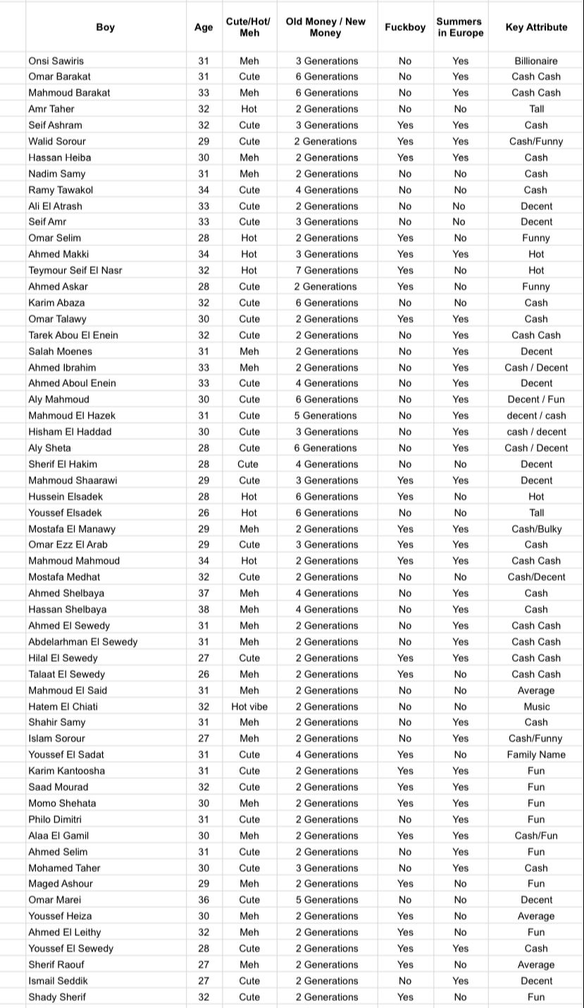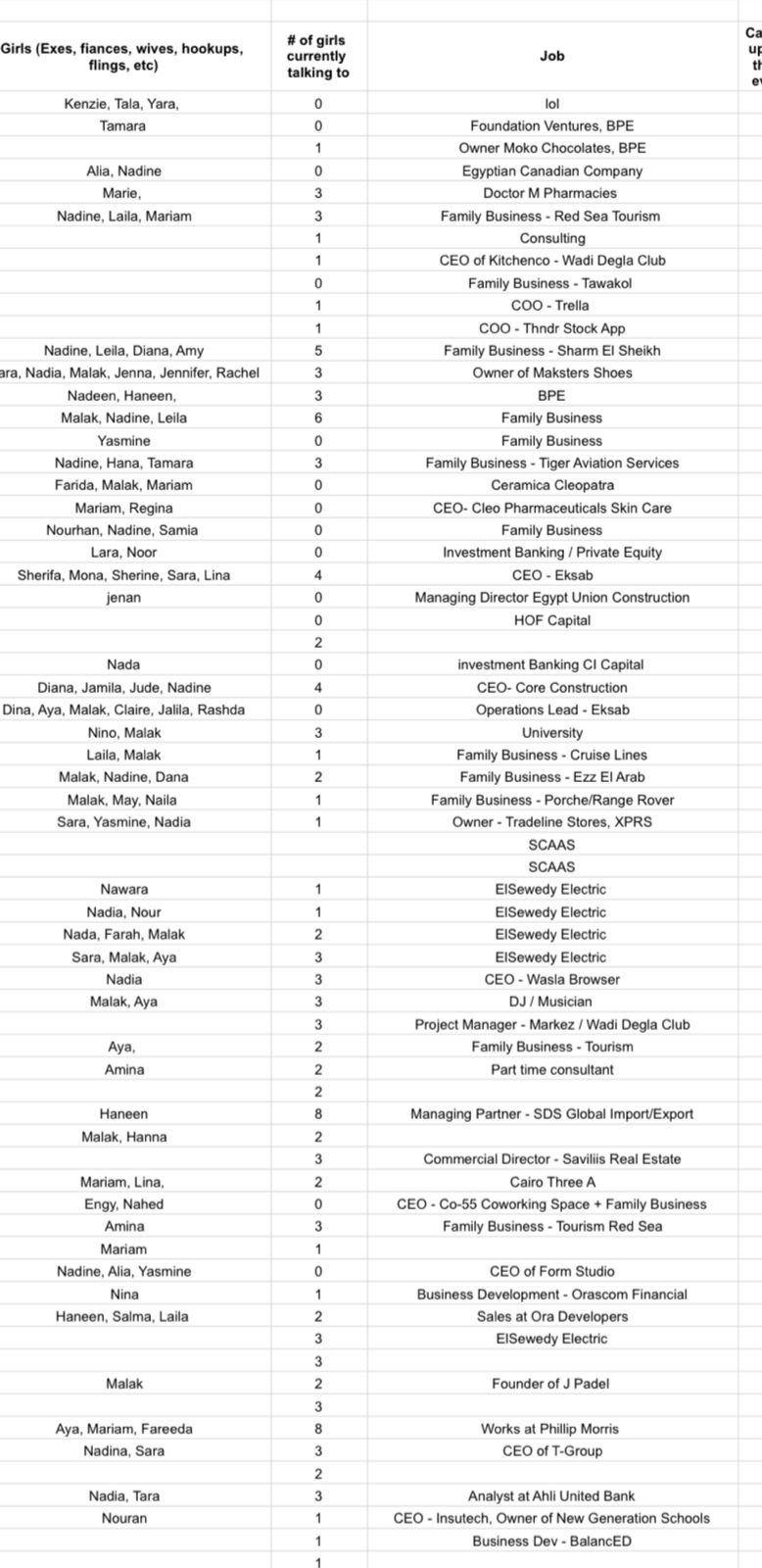 ووضعت الفتاة، ما يقرب من 100 اسم رجل، من رجال الأعمال الشباب في مصر، والذين يمتلكون مناصب عليا، في شيت إكسل، ضمن قائمة بها مميزات كل رجل، وبعض المعلومات الشخصية عنه، ومنها ما إذا كان دائم السفر خارج البلاد أم لا، ومكان المصيف، وعلاقاته النسائية السابقة، وتاريخ ثرواتهم، وصفاتهم الروحية، ومدى الذكاء لديهم.