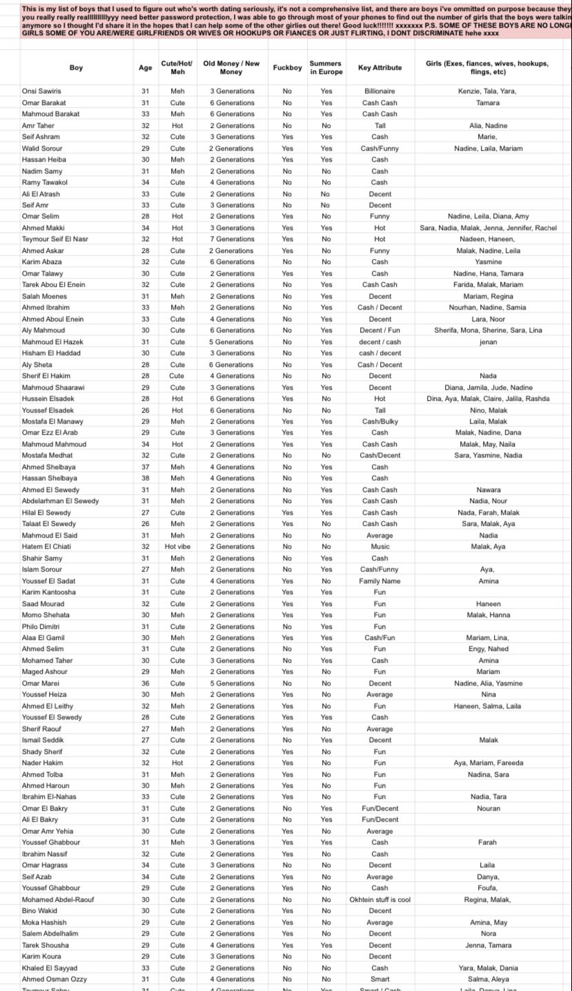 وأضافت: أيضا يا فتيات، لقد تمكنت من الاطلاع على معظم هواتفك لمعرفة عدد الفتيات اللواتي كان الأولاد يتحدثون إليهن، ولقد خطبت مؤخرًا، لذا لم يعد لدي أي فائدة من هذه القائمة بعد الآن، لذا ظننت أنني سأشاركها على أمل أن أتمكن من مساعدة بعض الفتيات الأخريات.. حظًا سعيدًا، ملاحظة بعض هؤلاء لم يعودوا في السوق، إنها ليست قائمة محدثة، والفتيات بعضكم كن صديقات أو زوجات أو خطافات أو خطائط أو مجرد مغازلة، أنا لا أميز بينكما.