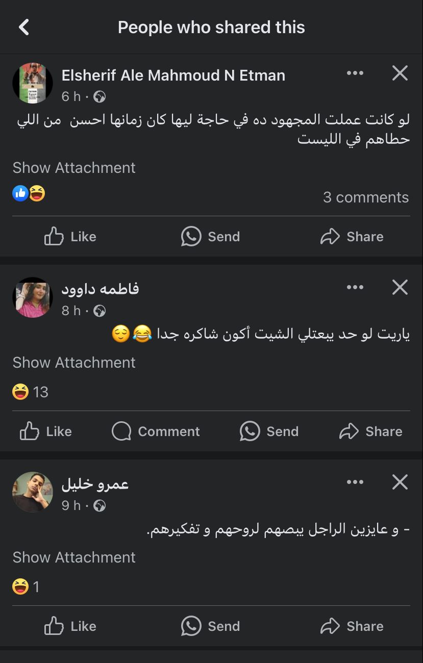 وقالت إحدى الفتيات في منشور لها عبر فيسبوك: في موضوع عبر تويتر عن بنت عاملة قائمة عن ما يقارب الـ 100 وشوية راجل من رجال الأعمال الشباب، وأي حد شغال شغلانة ثقيلة في البلد كاختيار زوج مستقبلي.
