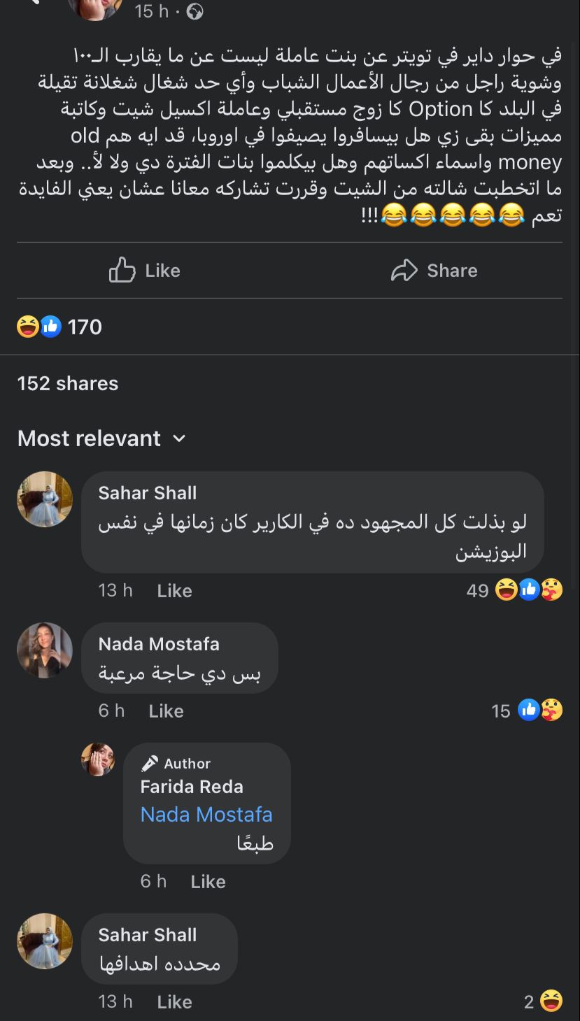 وتابعت الفتاة عبر فيسبوك: البنت عاملة شيت إكسيل وكاتبة مميزات كل رجل، زي هل بيسافروا يصيفوا في أوروبا، وقد ايه هم old money وأسماء إكساتهم وهل بيكلموا بنات الفترة دي ولا لأ، وبعد ما اتخطبت شالته من الشيت، وقررت تشاركه معانا عشان يعني الفايدة تعم.