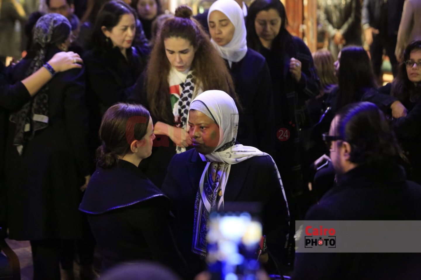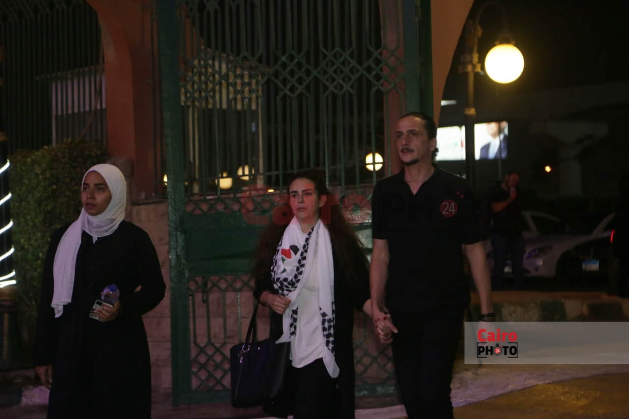 ظهرت الفنانتان دنيا عبد العزيز وفيدرا في عزاء الراحل أشرف عبد الغفور بالشال الفلسطيني، مما لفت الأنظار وسط الحاضرين.
