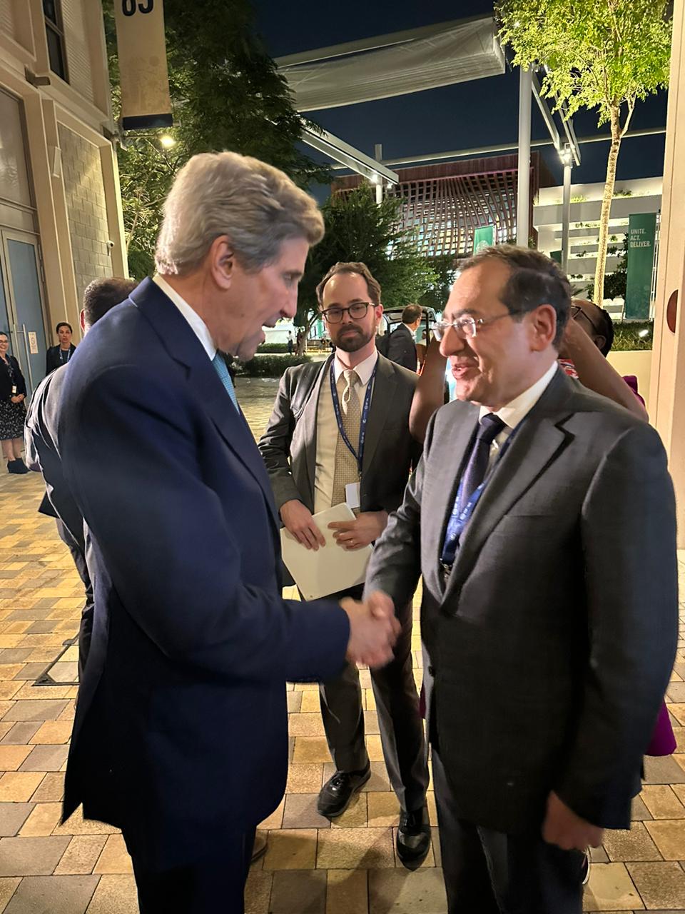 والتقى الوزير خلال الجولة التفقدية، جون كيري، المبعوث الرئاسي الأمريكي لشئون المناخ وتناولا حديثًا حول معطيات العمل على زيادة مساهمة الطاقات الجديدة والمتجددة في مزيج الطاقة العالمي وأهمية العمل على حشد المزيد من التمويل لدعم ذلك في إطار الرؤية الهادفة لأن يكون الاعتماد الأساسي عليها بحلول عام 2050، وكذلك أهمية تدعيم جهود مقدمي الطاقة في التزامهم بخفض الانبعاثات وتحسين كفاءة عمليات إنتاج واستهلاك الطاقة لضمان تأمين الإمدادات وتلبية احتياجات النمو والتنمية.