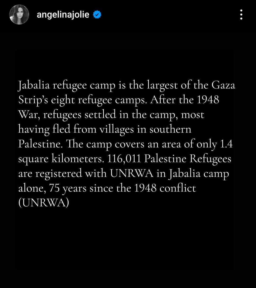 يذكر أن تصريحات النجمة الأمريكية أنجينا جولي جاءت بعد دعمها الكامل لفلسطين، وإدانتها لأفعال الجيش الإسرائيلي من قصف وتدمير المنازل والمدارس والمساجد وقتل الكثير من الأطفال والنساء وكبار السن، إذ نشرت أنجلينا عبر حسابها الشخصي على موقع تبادل الصور والفيديوهات، صورة لقطاع عزة وكتبت عليها: هذا قصف متعمد للسكان المحاصرين الذين ليس لديهم مكان للفرار.