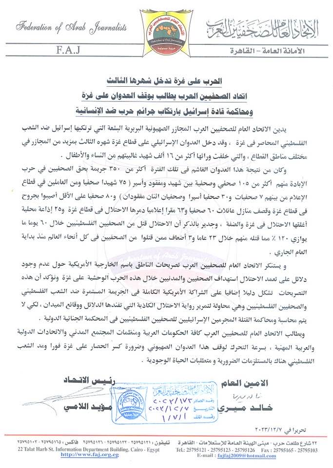 وطالب الاتحاد العام للصحفيين العرب، كافة الحكومات العربية، ومنظمات المجتمع المدني، والاتحادات الدولية والعربية المهنية، بسرعة التحرّك لوقف هذا العدوان الصهيوني، وضرورة كسر الحصار على غزة فورًا، ومد الشعب الفلسطيني هناك بالمستلزمات الضرورية ومتطلبات الحياة الوجودية.