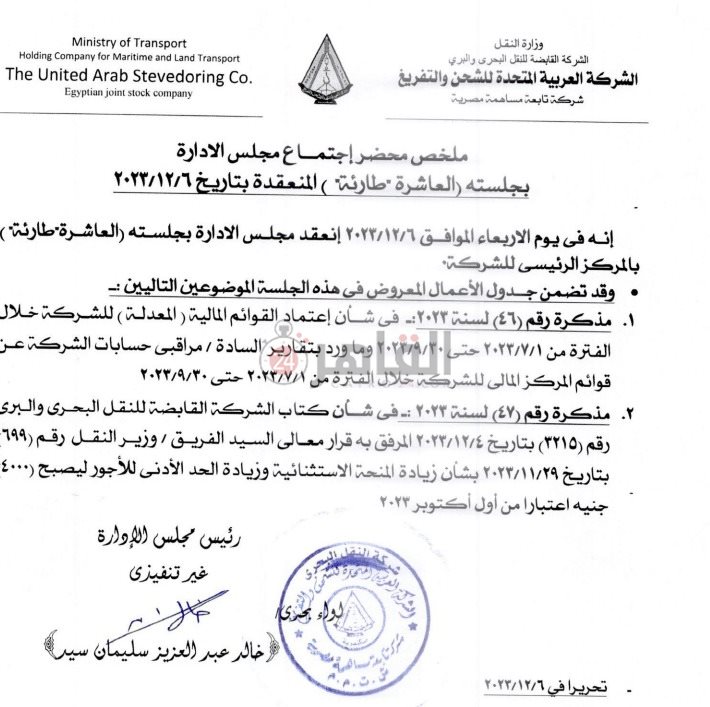 2- مذكرة رقم 74 لسنة 2023، في شأن كتاب الشركة القابضة للنقل البحري والبري رقم 3215 بتاريخ 4 / 12 / 2023 بشأن زيادة المنحة الاستثنائية وزيادة الحد الأدنى للأجور ليصبح 4000 جنيها اعتبارا من أول أكتوبر 2023.