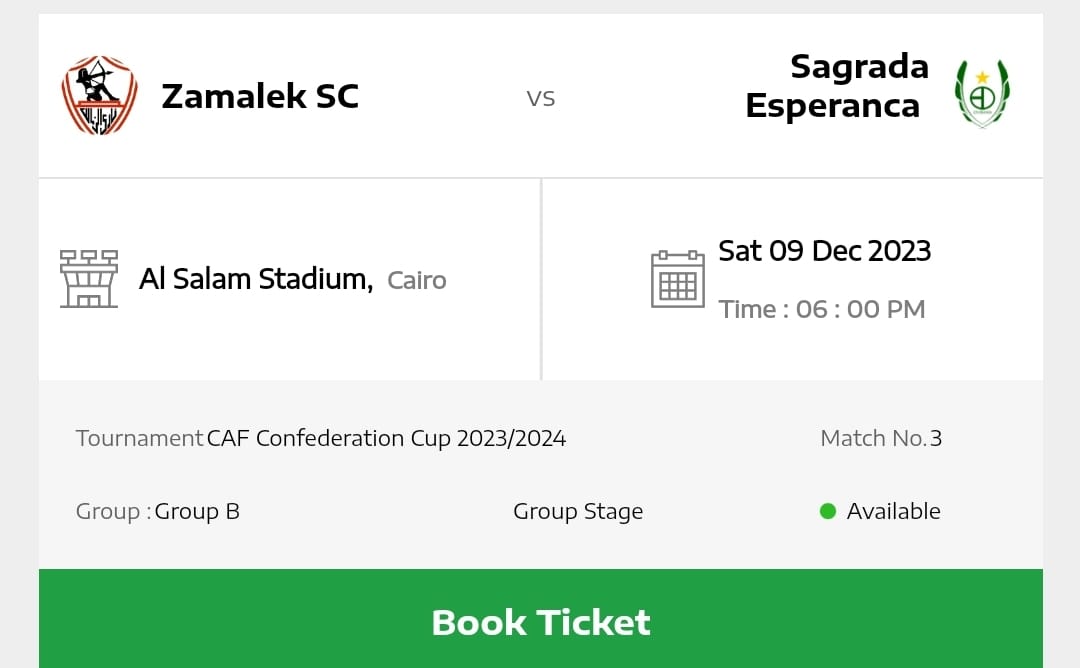 في الوقت نفسه، أعلنت شركة تذكرتي المسؤولة عن تذاكر المباريات، طرح 15 ألف تذكرة لمواجهة الزمالك وساجرادا الأنجولي، عبر موقعها الرسمي.