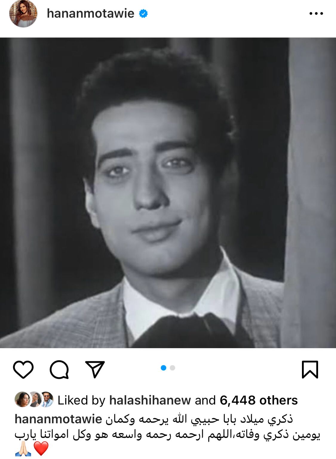 وشاركت حنان مطاوع صورة لوالدها عبر حسابها بموقع تبادل الصور والفيديوهات انستجرام، وعلقت قائلة: ذكرى ميلاد بابا حبيبي الله يرحمه، وكمان يومين ذكرى وفاته، اللهم ارحمه رحمة واسعة هو وكل أمواتنا.