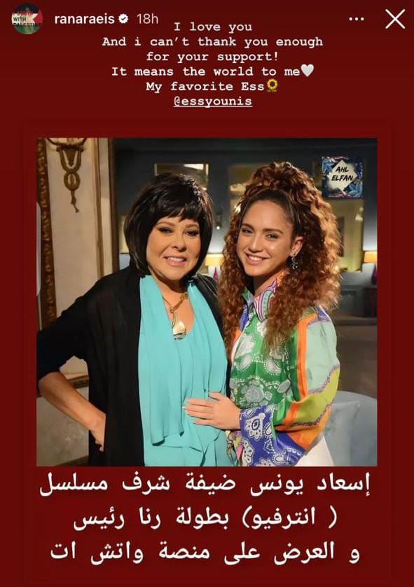 شاركت رنا رئيس متابعيها صورة جمعتها مع إسعاد يونس، عبر حسابها الشخصي بموقع انستجرام، وعلقت عليها قائلة: أحبك ولا أستطيع أن أشكرك بما فيه الكفاية على دعمك، إنه يعني العالم بالنسبة ليّ.