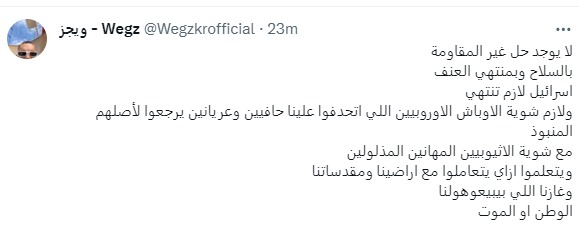 وكتب ويجز عبر حسابه الرسمي على موقع X: لا يوجد حل غير المقاومة بالسلاح وبمنتهى العنف.. إسرائيل لازم تنتهي ولازم شويه الأوباش الأوروبيين اللي اتحدفوا علينا حافيين وعريانين يرجعوا لأصلهم المنبوذ.