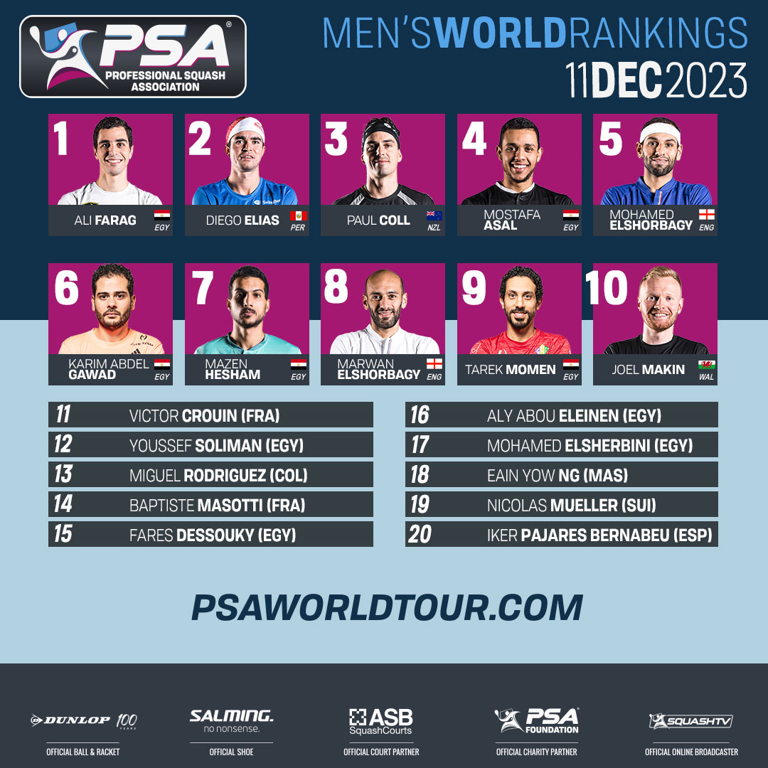 واصل البطل المصري علي فرج، تصدره لتصنيف رجال الاسكواش، في التصنيف الأسبوعي الصادر من الرابطة الدولية لمحترفي الاسكواش.